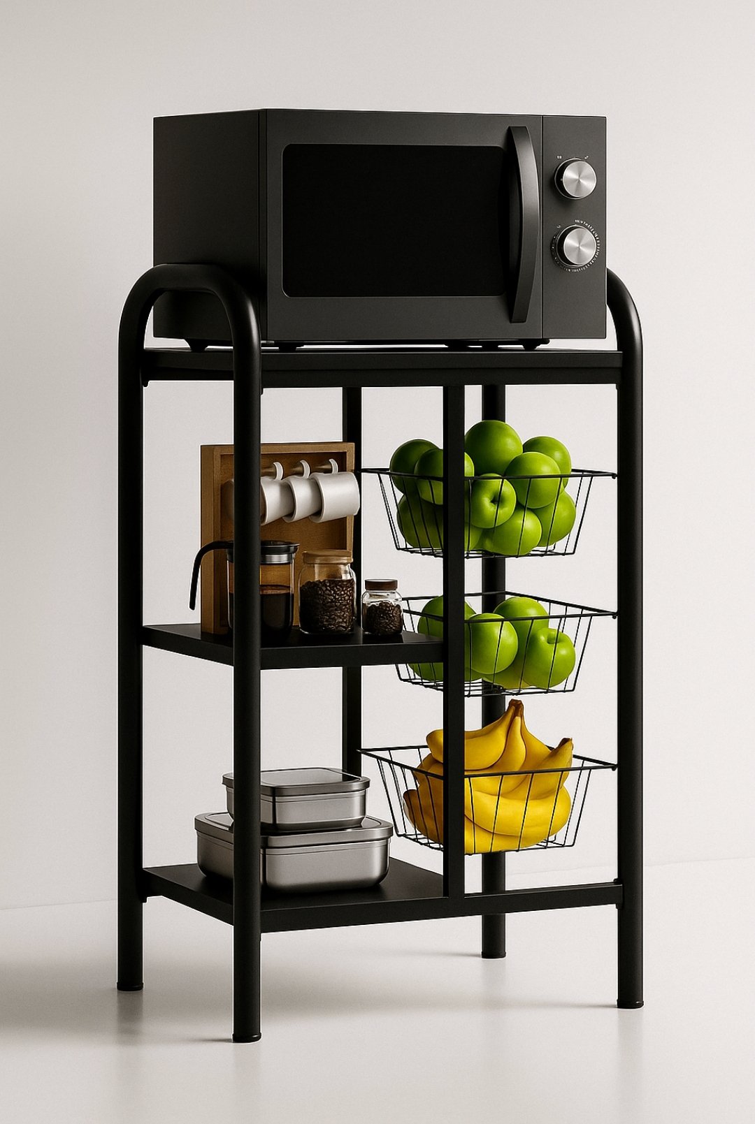 A Fruteira FLEX da GOL TUBULARES possui 1 prateleira para forno e cestos aramados para deixar a sua cozinha muito mais organizada. Ela possui 1 prateleira superior que permite você colocar forno micro-ondas ou elétrico. As 3 cestas aramadas são reforçadas e possibilitam que guarde frutas e legumes com facilidade e para fácil acesso. As prateleiras são em ardósia, que além de agregar qualidade, dão ao móvel todo charme que o seu ambiente merece. A fruteira para micro-ondas e forno é fabricada com tubos laterais em aço de alta qualidade, garantindo robustez e o máximo de resistência à estrutura da peça. Sua cozinha merece um móvel que a deixe ainda mais bonita e arrumada.